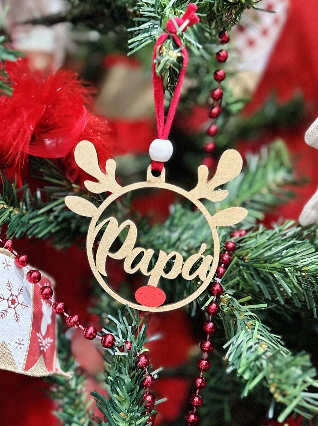 Adorno Papá reno para navidad, cortado en madera natural y decorado con una cinta roja para colgar. Incluye la palabra “Papá” integrada en el diseño, ideal para darle un toque cálido y familiar al árbol de Navidad.